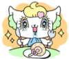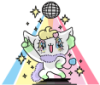Description: Pero pero sparkles character on a stage, in the spotlight, pointing to the sky.